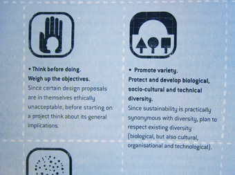 In particular, the fist guideline formulated as “Think before doing. Weigh up the objectives (since certain design proposal are in themselves ethically or environmentally unacceptable, before starting on a project think about its general implications” is intended as a way to temperate the innovation-oriented mind of designer, discourage innovations that are not useful and propose to consider existing artefact and what can be done with them before inventing new ones.